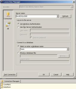 3. Add a new OLE DB connection manager pointing to the instance and database where the data will be stored. I’ve called mine “DataStore”.
