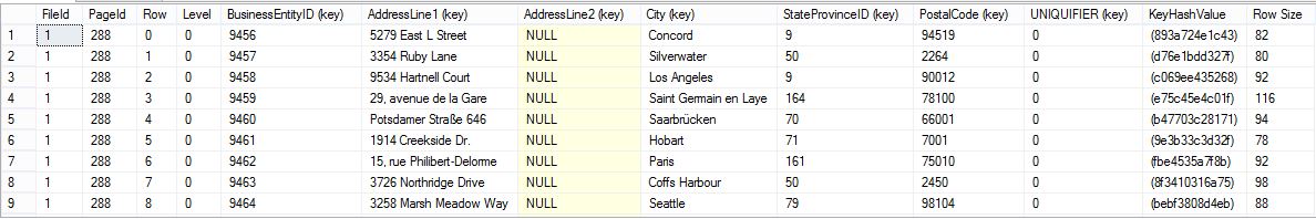 The clustered index (CI) is on the 5 address columns and there are non-clustered indexes (NCI) on the BusinessEntityID and the 3 name columns. We can look at the structure of a page from one of the indexes by using sys.dm_db_database_page_allocations and DBCC PAGE (links are in the code below).