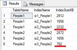 So exactly what I expected. ix1 & ix2 are about the same size in both tables. However ix3 for table People1 is about three times the size of ix3 on People2. Not a big deal with a small table with only 3 indexes. You get to a mm row table with 5 or 6 NCIs it could get rather significant.