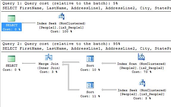 I realize it’s a bit of a goofy query but it does demonstrate the point. In People1 where the CI contains the address information the optimizer was able to use ix3 as a covering index. In People2 where the CI is the BusinessEntityID the optimizer had to use both ix2 and ix3 and ended up taking 95% of the combined time of the two queries. Since the columns in the CI are in all indexes they can always be used when determining if the index covers a query.
