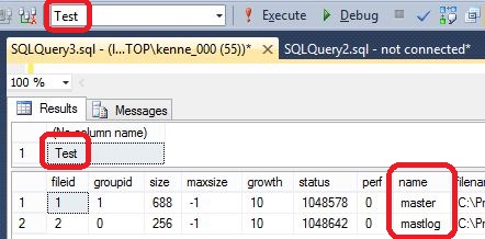USE Test; GO DROP PROCEDURE sp_Test; GO USE master; GO ALTER PROCEDURE sp_Test AS SELECT DB_NAME(); SELECT * FROM sys.sysfiles; GO USE Test; GO EXEC sp_Test; GO