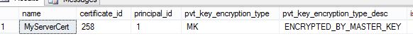So the private key was encrypted using the database master key. We can confirm this by looking in sys.certificates.