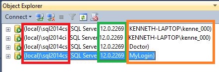 Notice that for each connection there is the instance name (red box), the version of SQL Server (green box) and the name of the login connected (orange box).