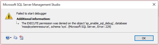 I am a sysadmin, I develop, and I support about a hundred developers who are not sysadmin on the corporate servers ( but can be a sysadmin on any SQL Server that they run on their own boxes). I debug stored procedure code while I am writing it, but instead of debugging a stored procedure call, I debug the T-SQL batch used within the stored procedure’s definition. If the stored procedure accepts parameters I instead declare them as variables (when I plan on debugging). I set break points, start the debug session, and let the code run. The code will stop running when the breakpoint is hit, and display my variables’ values at the breakpoint. I consider whether the variables values are reasonable at the breakpoint line, and adjust my stored procedure code if values are not what I expect my code to have assigned. More often than not my stored procedure is performing recursion and/or controlling its code flow in a Row By Agonizing Row manner (when I am dragged, kicking and screaming, into writing RBAR code).