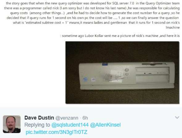 And to be fair, it is. It’s an estimate of how many seconds a query would take, if it was running on a developers workstation from back in the 90’s. At least that’s the story. In fact Dave Dustin (t) posted this interesting story today:
