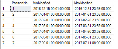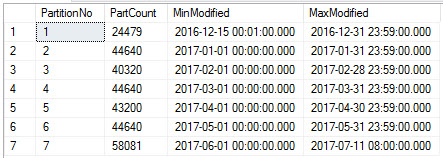 SELECT $Partition.pfWhatsInAPart(Modified) PartitionNo, COUNT(1) AS PartCount, min(Modified) MinModified, max(Modified) MaxModified FROM WhatsInAPart2 GROUP BY $Partition.pfWhatsInAPart(Modified) ORDER BY $Partition.pfWhatsInAPart(Modified); GO