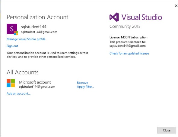 Here you can sign into your Microsoft account and associate it with Visual Studio.