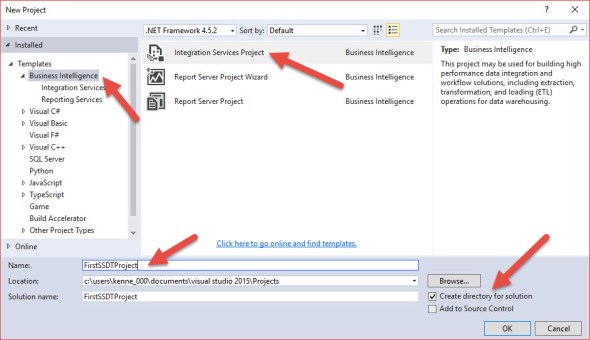 Here we have a number of options. We want to select the template Integration Services Project. Pick a name for the project and solution (default for the solution name is the project name). Then depending on if you check Create directory for solution or not you will either find your sln file in one of the following two directories: