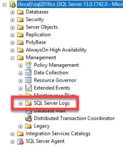 Just to be very clear, I’m talking about the SQL Server Log, not database logs. Sometimes this is called the Error Log (and in fact the text files containing the data are named ERRORLOG, ERRORLOG.1, etc) although it contains a lot more information than just errors. And just to make things even more nice and confusing the GUI calls it the “SQL Server Logs”.