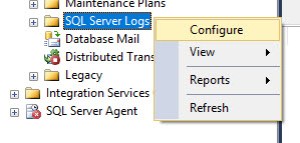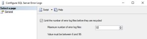 Now your the log files will contain a manageable amount of information. An added benefit is that if you had a problem on Thursday you can open the log for just that day. There is, however, a fairly important thing to remember here. By default SQL Server only keeps 6 log files! That means if you are cycling your log every day you have less than a week’s worth of information available. You can fix this by telling SQL Server to keep more logs.