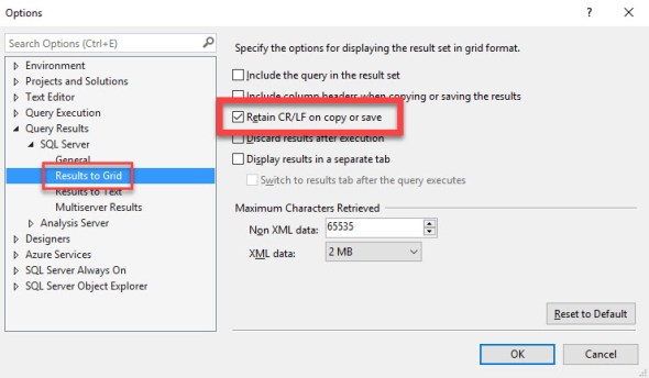 To check the output in the SQL server, have also set ‘Retain CR/LF on copy or save’ under query options.