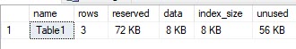 My Table1 table has 3 rows, is 72KB in size of which 8KB is data, 8KB is indexes and 56KB is unused. And best of all the output is in a single row.