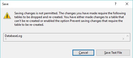 Microsoft does a lot of things to try to help us not shoot ourselves in the foot. This little error is one of them. It’s an annoying error, and almost everyone turns it off automatically, so what is it and why is it there? Well, by default, when using the table designer, you cannot save the change if it requires dropping and re-creating the table. For example you have a table called DatabaseLog with several columns.