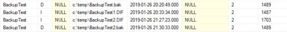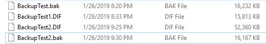 BACKUP DATABASE BackupTest TO DISK = 'c:\temp\BackupTest1.DIF' WITH DIFFERENTIAL;
