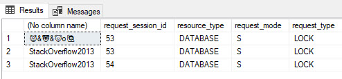 You can see that my previous session (session_id = 53) has locks in more than one database. It actually has more than just those two locks but for these purposes, I only care about the DATABASE locks. You’ll also see that spid 54 has a database lock and my current session (55) doesn’t have any database locks.