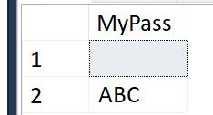 Now that’s odd right? The MyPass column in the first row looks empty, and in fact if I copy and paste it I don’t get anything. (The second row was added for control so you can see nothing there is nothing special about the table.) But look at this: