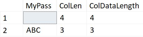 datalength(MyPass) AS ColDataLength