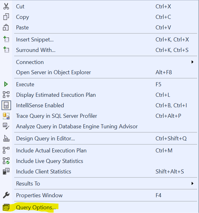 And the last thing I’ll mention here is that if for some reason you need to change these (or any number of other) settings for a specific query window you can go to the Query menu or right click in the query pane and then go to Query Options.