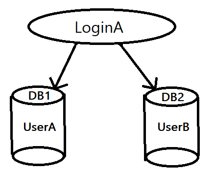 Notice that you can go from LoginA to either DB1 or DB2, but not directly from DB1 to DB2 or back. If you are impersonating UserA you only have access to DB1. Same with UserB and DB2. However, if you are impersonating LoginA then you can access both DB1 and DB2 since LoginA maps to both UserA and UserB. So if for whatever reason you need to get to multiple databases while impersonating a different Id make sure you are using EXECUTE LOGIN. If you only need access to a single database then you can really use either. Unless of course you want it to fail when it unexpectedly tries to access another database. And yes, I’ve used EXECUTE USER for that specific reason before.